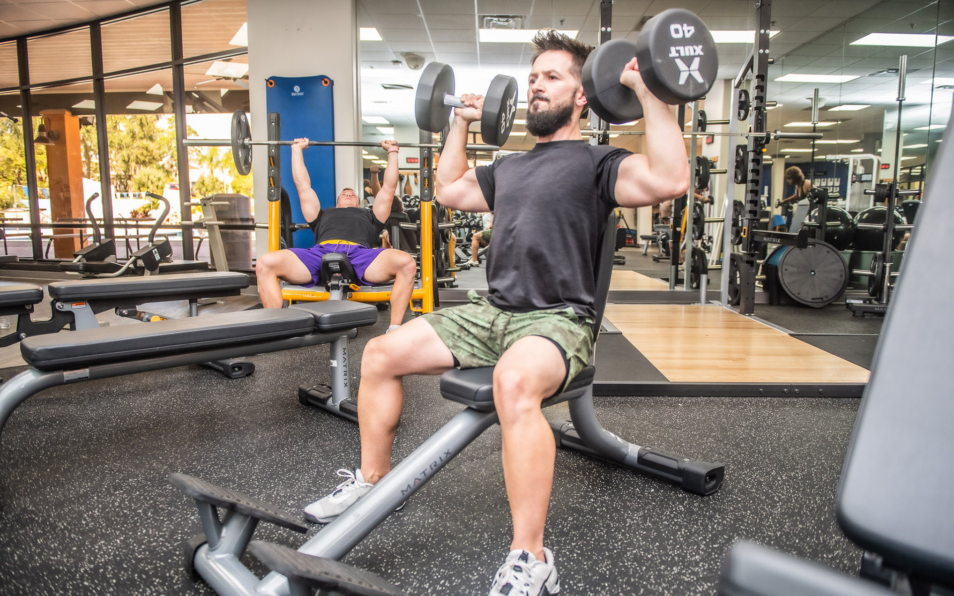 • State-of-the-art equipment to include: Matrix treadmills, upright and recumbent bicycles, Ellipticals, Step Mill, Techno Gym resistant weight machines, Squat Rack Platform, free weight benches, plates & bells