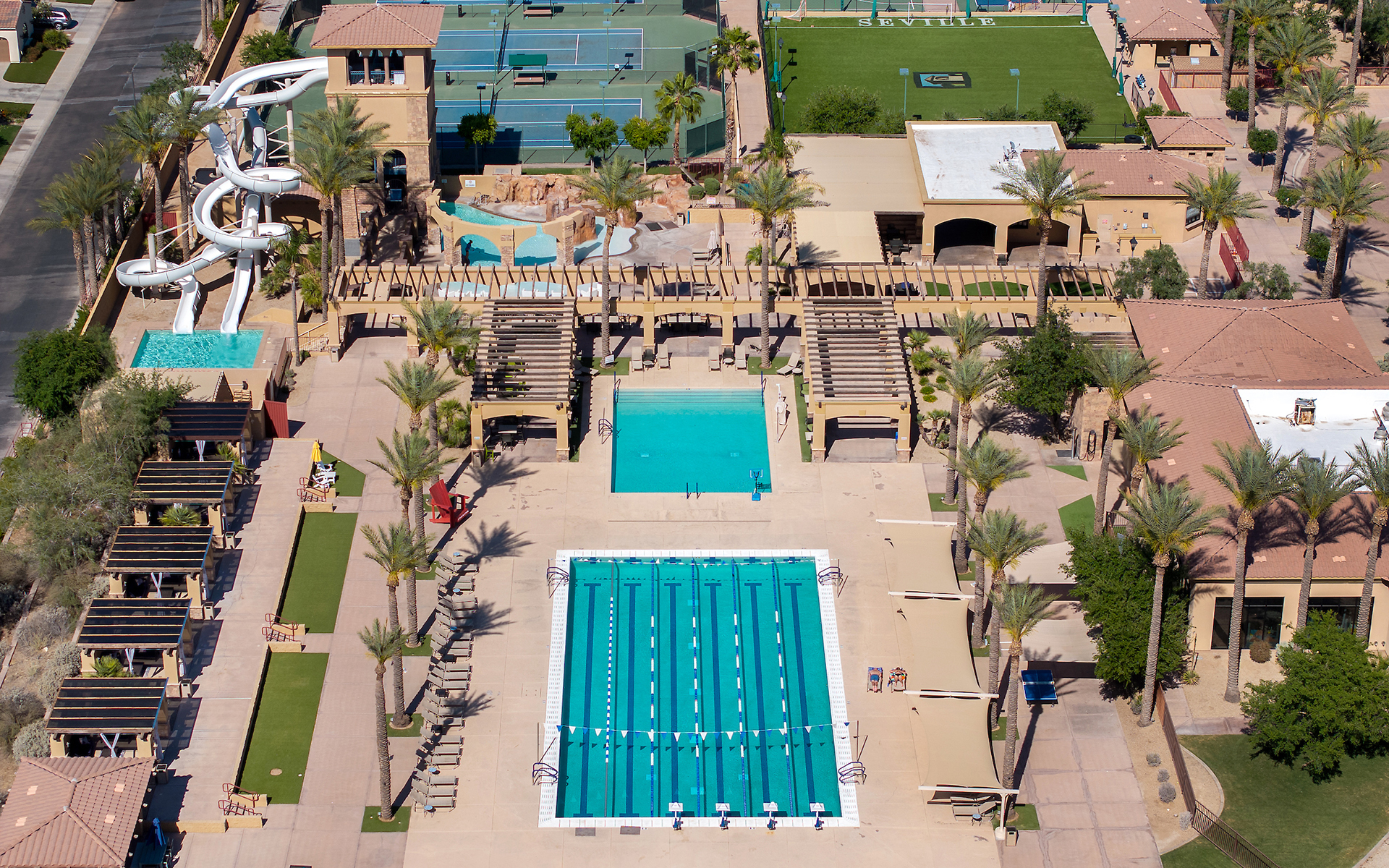 Experience an oasis in the desert at Seville's resort-style waterpark, boasting four distinct pools including a terrace pool, negative edge lap pool, exhilarating waterslides, and a tranquil lagoon pool, all heated for year-round enjoyment. Relax in luxurious cabanas, savor poolside dining with crafted cocktails, or refine your skills with swim lessons, while the Sharks swim team adds a competitive edge for juniors.
